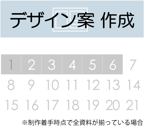 制作物の内容と仕様・お見積内容をご承諾頂き次第、作成に際して必要な資料(記載文面・画像・ロゴ等)をお送り頂き、デザイン草案作成を開始します。 デザイン草案は概ね5日程度のお時間を頂きます。(受注混雑具合により前後します) 最初のデザイン草案をご覧頂き、この時点で発注確定か*取消しかをご決定頂きます。 *【発注取消しの場合について】 テイストミスマッチを防ぐ為の仕組みです。お客様がデザイン草案をご覧になった後に発注しない選択をされた場合、デザイン著作権は移管されません。お客様が本デザインをご使用(改変使用含む)する事は出来ませんのでご注意ください。お支払いはデータ入稿または納品と同時に確定しますので、この段階で発注を取り消された場合、お支払いは発生しません。 |