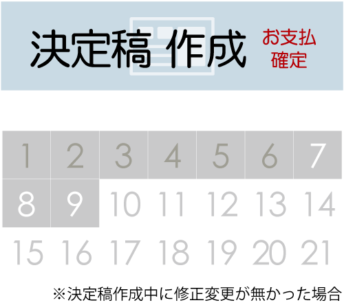 デザイン草案から修正・変更点のご希望を頂き、決定稿まで制作を進めます。 決定稿完成までは概ね2〜3日程度のお時間を頂きます。 (受注混雑具合により前後します) 大規模な修正変更には追加料金が発生する場合がございますので、修正変更のご依頼都度にその旨をお伝えします。 最初にお送り頂く資料の完成度が高いほど追加料金の発生を防ぐ事が適います。 記載内容やデザイン等に関しては制作着手前に十分ご相談ください。 当方も極力追加料金が発生せずに済む方法を、随時ご提案します。 |