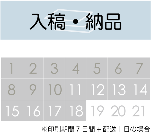 ご入金確認後、即日入稿(印刷業者)またはデータ納品(発注者様)します。 各制作物の印刷期間+納期は以下の通りです。 【納期】 ●データ納品 →即日 ●紙媒体の印刷物 →5〜8日間程度 ●グッズ等 →10〜14日間程度(品目による) ※ 納品をお急ぎの場合は特急料金で割高となりますが、御入り用の際はご相談ください。 |